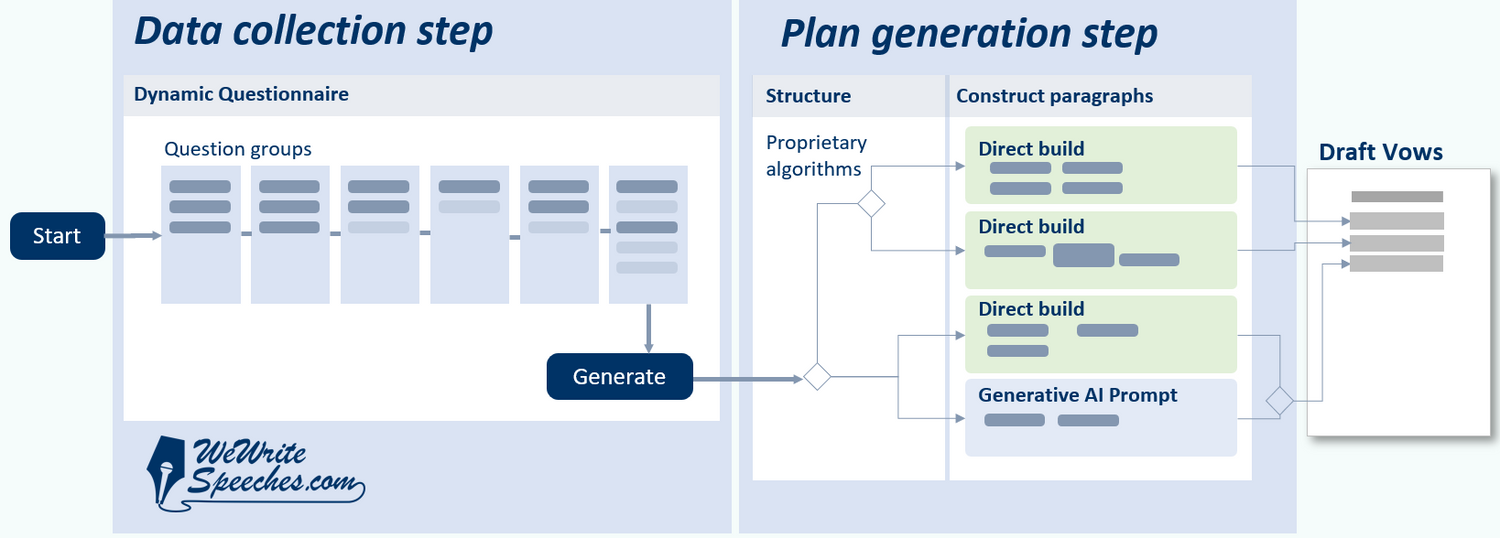Use this project to write beautiful wedding vows. Vows are supposed to be written by you, not for you, so while this project is powered by our speechwriting tool, it uses Large Language Model (LLM) technology only for one sentence.